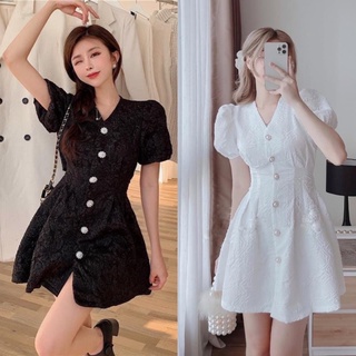 Đầm Váy Gấm Cut-Out Lưng Chun Cúc Ngọc Tay Phồng dáng xòe chữ a chất xốp về 2 màu trắng, đen phong cách ulzzang