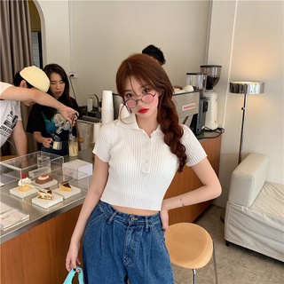 Happy-store Áo croptop dệt kim tay ngắn cổ polo thời trang Hàn Quốc thanh lịch