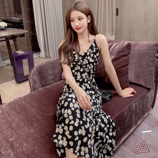 Đầm Hai Dây Dáng Chữ A Màu Đen Họa Tiết Hoa Cúc Phong Cách Pháp