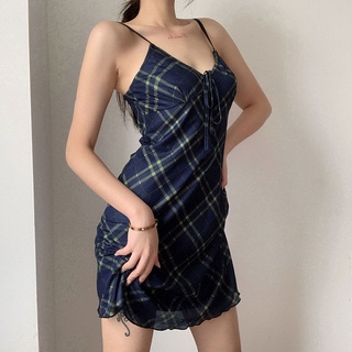 Đầm Hai Dây Phối Lưới Họa Tiết Sọc Caro Thiết Kế Mới Quyến Rũ Thời Trang Theo Phong Cách Âu Mỹ Cho Nữ