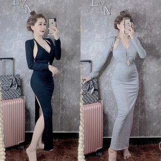 Đầm body cổ yếm hở lưng 2 dây chun tay dài hở khoe vai hot chất thun xốp đẹp
