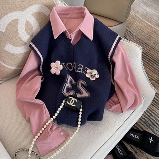 Bộ Áo Sơ Mi Dài Tay Phối Ren + Áo Khoác Ghi Lê Phong Cách Hàn Quốc Thời Trang Cho Nữ