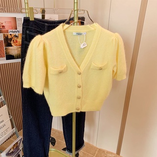 Áo Cardigan Ngắn Tay Phồng Màu Vàng Phong Cách Châu Âu Mẫu Mới Thời Trang Cho Nữ
