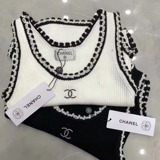 Áo Dệt Kim Sát Nách Cổ Tròn Xẻ Tà Màu Trắng Đen Phong Cách Mới Cho Nữ