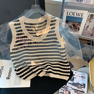 Áo Dệt Kim Sát Nách Cổ Tròn Họa Tiết Kẻ Sọc Màu Sắc Tương Phản Phong Cách Retro Hong Kong