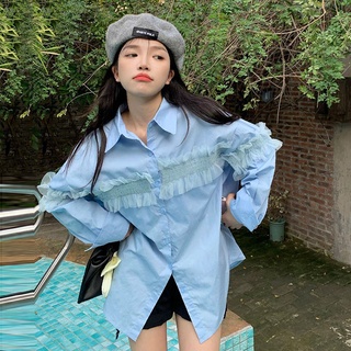 Áo Sơ Mi Tay Phồng Dáng Rộng Màu Xanh Dương Nhạt Phong Cách Cổ Điển Thời Trang Mùa Hè Mới Cho Nữ
