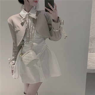 Áo Khoác Ngắn Cột Dây + Áo Sơ Mi Xếp Ly Eo Hẹp Một Mảnh Phong Cách Preppy Cho Bé Gái