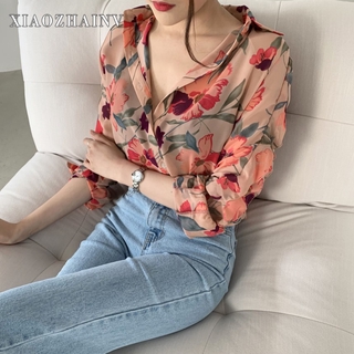 Xiaozhainv Áo Kiểu Tay Dài Hoạ Tiết Hoa Thiết Kế Dáng Rộng Thoải Mái