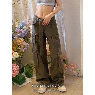 Quần jean nữ Xiaozhainv ống suông rộng cạp cao phối túi hộp cá tính