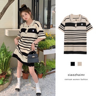 Xiaozhainv Đầm polo Dệt Kim Tay Ngắn Dáng Rộng Họa Tiết Kẻ Sọc Thời Trang Mùa Hè Cho Nữ