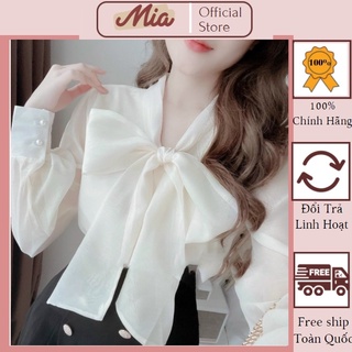 Áo sơ mi trắng nữ, áo sơ mi dài tay nữ kiểu thắt nơ tiểu thư vảo tơ - Mia Shore M108