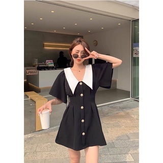 (Có Bigsize) Đầm Váy Đen Phối Cổ Trắng Nút Ngọc Chít Li Eo Trẻ Trung Mặc Đi Chơi Dạo Phố Dự Tiệc