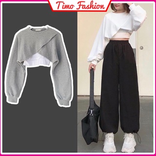 Áo croptop tay dài form rộng, áo kiểu nữ croptop tay phồng co giãn tặng kèm bra Ulzzang, phong cách Hàn Quốc, AO011