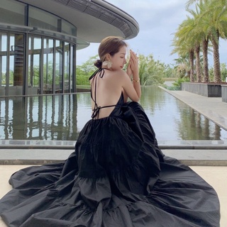 Jane Váy maxi đi biển xòe nhẹ hở lưng màu đen quyến rũ