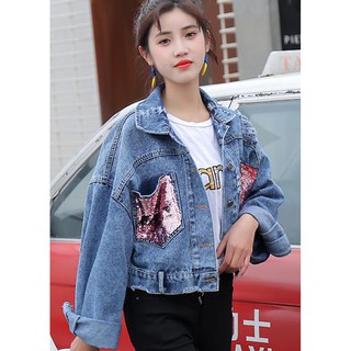 Áo Khoác Nữ Tính Kiểu Áo Khoác Jean Phối Đính Kim Sa Hồng ROMI 1879