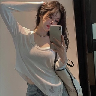 Áo Thun Lửng Tay Dài Cổ Chữ V Màu Sắc Đơn Giản Cho Nữ
