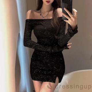 Đầm ôm dáng trễ vai màu đen đính đá thời trang cho nữ
