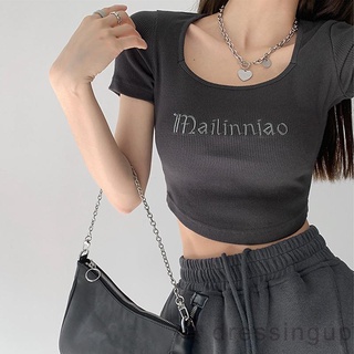 Áo croptop dệt kim tay ngắn cổ vuông thêu chữ thời trang mùa hè cho nữ