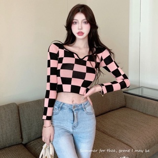 Áo Kiểu Nữ Ca Rô Dài Tay Cổ Vuông Hở Eo Thời Trang