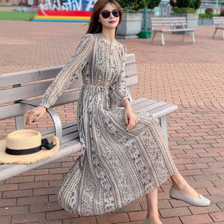 Đầm Chiffon Nữ Dài Tay Cổ Tròn Xếp Ly Thời Trang Hàn