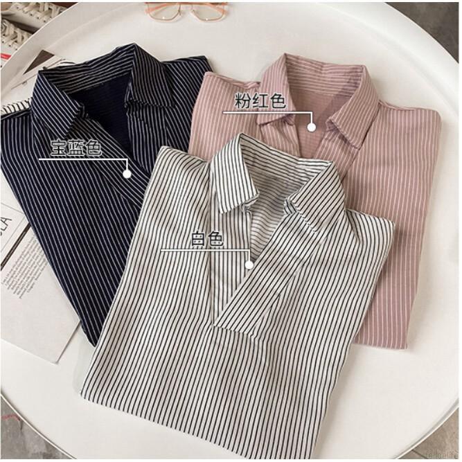Áo sơ mi suông cổ chữ V kẻ sọc thời trang cho nữ