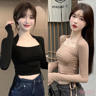 Áo Croptop Tay Dài Phối Dây Cột Hoa Thiết Kế Cổ V Gợi Cảm Cho Nữ Áo Sơ Mi