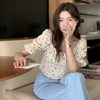 Áo Kiểu Chiffon Cổ Vuông Tay Ngắn Phối Dây Cột In Họa Tiết Hoa Xinh Xắn Cho Nữ