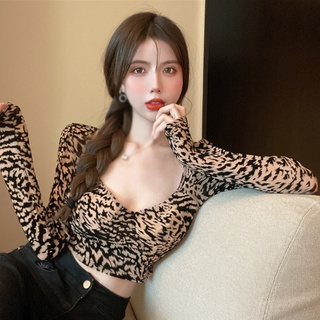 Áo kiểu dáng ngắn tay dài cổ vuông in họa tiết da báo quyến rũ dành cho nữ