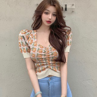 Áo Kiểu Ngắn Tay Cổ Vuông Phối Họa Tiết Hoa Xinh Xắn Thời Trang Dành Cho Nữ