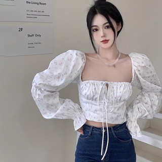Áo croptop tay dài phồng cổ vuông in họa tiết hoa thời trang cho nữ