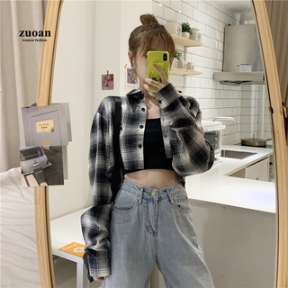 SUXI Áo croptop dài tay kẻ sọc ô caro