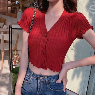 Áo SUXI dệt kim tay ngắn cổ chữ V màu sắc đơn giản dành cho nữ