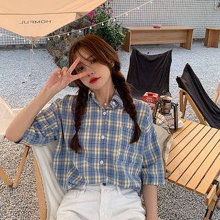 SUXI Áo sơ mi tay ngắn họa tiết caro phong cách Hàn Quốc cá tính cho nữ