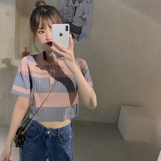 SUXI Áo croptop dệt kim tay ngắn cổ bẻ dáng ôm kẻ sọc thời trang mùa hè cho nữ