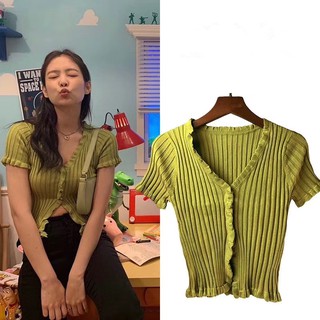 SUXI Áo croptop dệt kim tay ngắn thiết kế cổ chữ V dành cho nữ