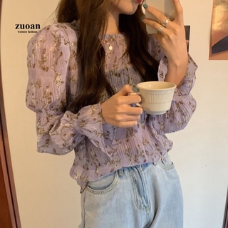 SUXI Áo Chiffon Dáng Rộng Họa Tiết Hoa Tím Phong Cách Hàn Quốc Cho Nữ