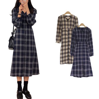Đầm midi SUXI tay dài phối họa tiết caro phong cách Hàn Quốc thời trang xinh xắn