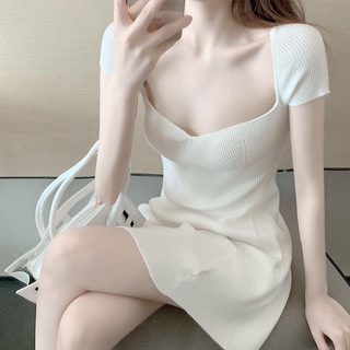 SUXI Đầm dệt kim ngắn tay cổ vuông thiết kế xinh xắn dành cho nữ