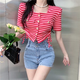 Áo Thun Tay Ngắn Cổ Vuông Họa Tiết Kẻ Sọc Phối Dây Rút Thời Trang Cho Nữ tao bao