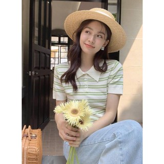 Áo Thun Dệt Kim Tay Ngắn Dáng Rộng Kẻ Sọc Ngang Trẻ Trung Hợp Thời Trang