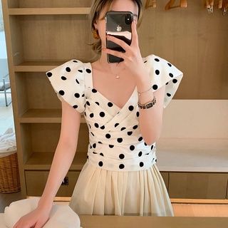 Áo Thun Tay Bay Cổ Vuông Họa Tiết Chấm Bi Trắng Đen Dễ Thương Cho Nữ tao bao
