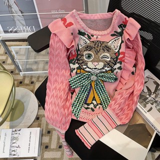 Áo Sweater Dệt Kim Cổ Bẻ Họa Tiết Mèo Đính Đá Kiểu Hàn Quốc Dễ Thương tao bao