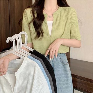 Áo Thun Ngắn Cổ Chữ V Giả Hai Lớp Phong Cách Waffle Mới