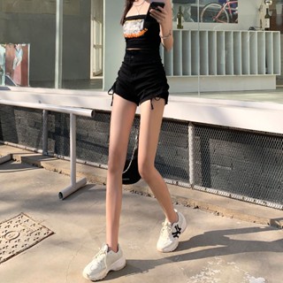 Quần Short Denim Màu Đen Lưng Cao Dáng Chữ a Phối Dây Rút Thời Trang Đường Phố Mỹ Cho Nữ