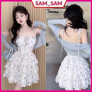 Váy 2 dây nữ - Đầm dự tiệc dáng hoa nhí 2 tầng mix áo cadigan có mút ngực ,chất lụa cao cấp tại sam_sam_shop_1011