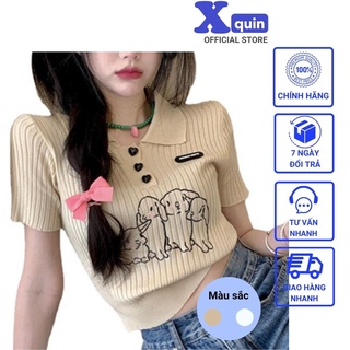 Áo polo nữ tay ngắn in hoạ tiết cún siêu xinh Xquin, Áo croptop nữ cổ trụ gài nút chất len tăm mềm mịn