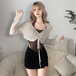 Kliou Set Áo Croptop Cổ Yếm + Áo Thun Tay Dài Dây Rút Thời Trang Mùa Thu Cho Nữ