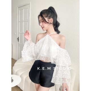 Áo trễ vai cổ yếm tay tầng ren hoa nhí tiểu thư .Shyncloset