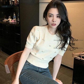 Áo Thun Dệt Kim Tay Ngắn Đính Nơ Màu Đỏ Hồng Eo Cao Thời Trang Mùa Hè Dành Cho Bạn Nữ