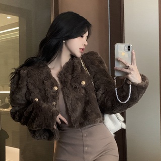 Áo khoác lông mềm dáng ngắn màu nâu tây sang trọng